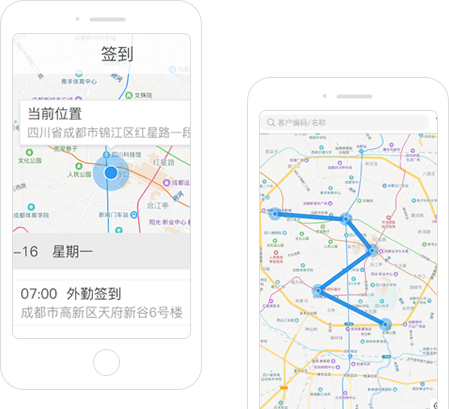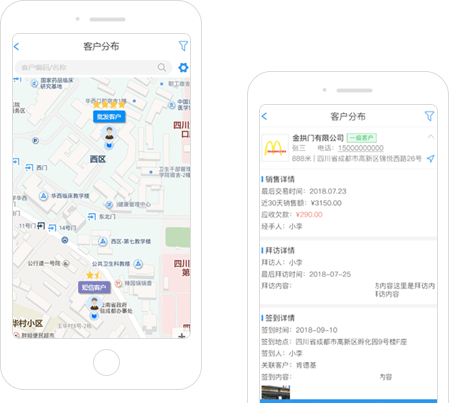 客户信息与位置在地图上清晰展示,级别、欠款、销售状况标注区分,帮助销售业务及时开展,客情维护精准到位,市场拓展情况一目了然。